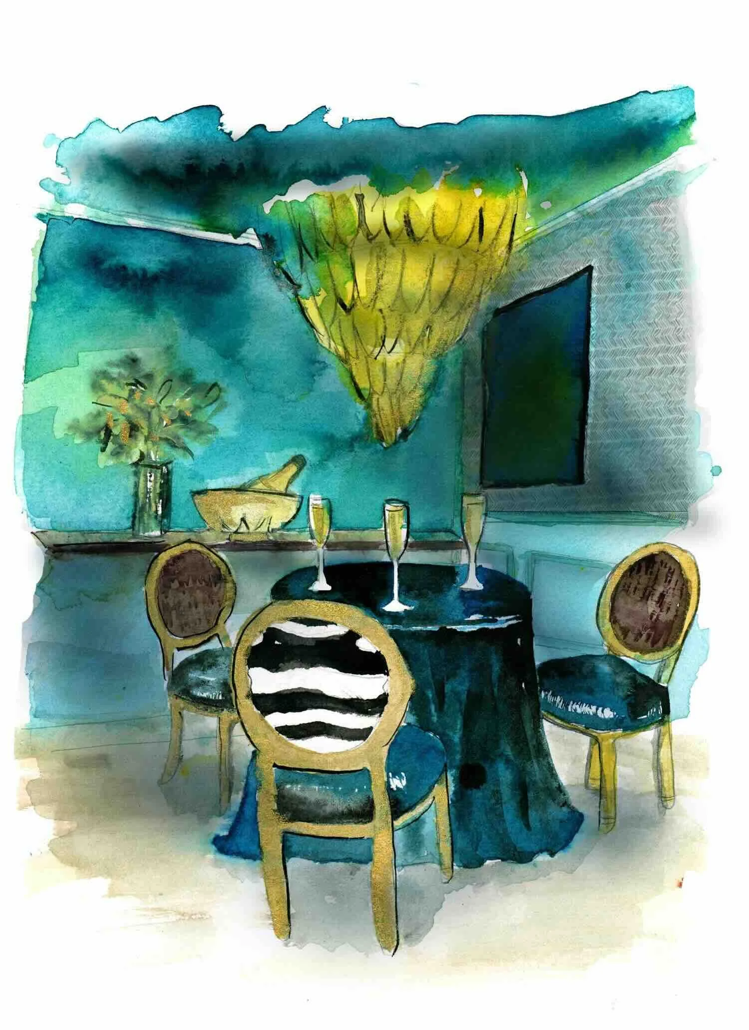 One of the standout pieces, showcased prominently on the magazine's website, is a hallway illustration that embodies a blend of elegance and creativity, featuring a textured ceiling, watercolor wall panels, and a bold chevron floor pattern in shades of teal, green, and black. This piece reflects Danielle’s skill in combining fine details with expressive, abstract elements to create a sense of movement and depth. The illustrated hallway invites viewers to imagine stepping into a luxurious, art-infused space, perfectly in line with Lifestyled's focus on high-end design and refined living.